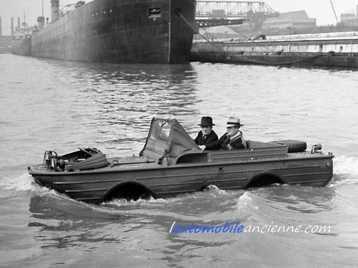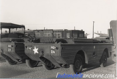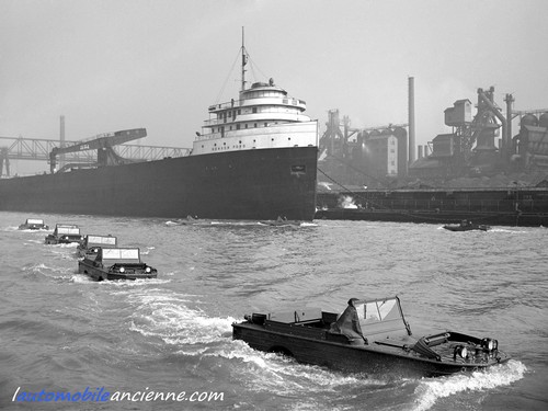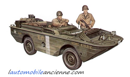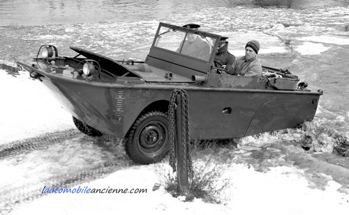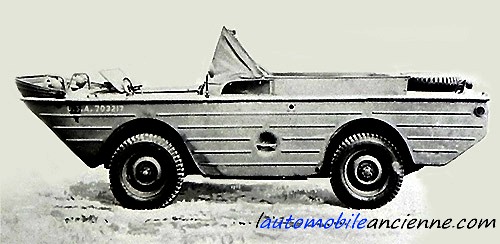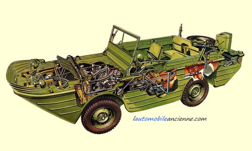 C’est ainsi qu’en 1942, Ford reçoit une commande de la part de l’armée américaine pour 50.000 GPA. Mécaniquement, cette voiture était mue par un quatre cylindres en ligne de 2.2 litres qui développait 60Ch. Cette voiture était une quatre roues motrices, le mouvement parvenait aux roues par le biais d’une boite à trois rapports. En milieu aquatique, la voiture était entraînée par une hélice à vis située dans la partie arrière carénée de la voiture qui comprenait également un gouvernail.