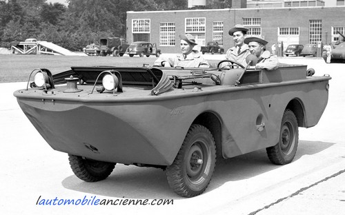 C’est ainsi qu’en 1942, Ford reçoit une commande de la part de l’armée américaine pour 50.000 GPA. Mécaniquement, cette voiture était mue par un quatre cylindres en ligne de 2.2 litres qui développait 60Ch. Cette voiture était une quatre roues motrices, le mouvement parvenait aux roues par le biais d’une boite à trois rapports. En milieu aquatique, la voiture était entraînée par une hélice à vis située dans la partie arrière carénée de la voiture qui comprenait également un gouvernail.
