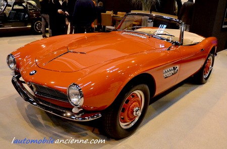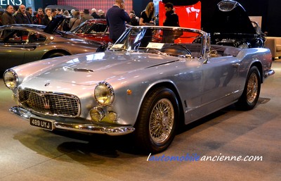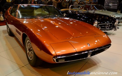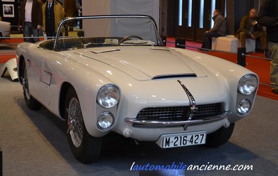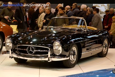 Attaquons désormais la plus grosse partie du salon, celle consacrée aux vendeurs de voitures, dans cette partie, que des voitures anciennes de prestige, les plus grandes marques sont représentées : Mercedes, Porsche, Ferrari, Maserati, Lamborghini … y sont monnaie courante, peut-être trop même, et l’on se prend à trouver une Mercedes 300SL banale, et on ne fait plus attention aux Porsche … ici, tout est à vendre, les prix sont rarement affichés, et quand ils le sont, ça fait … mal ! Au vu de la taille des stands, parmi les plus grands du salon, il était de toute façon certain de ne pas y voir de voiture populaire ! Voic donc une grosse série de photos :
