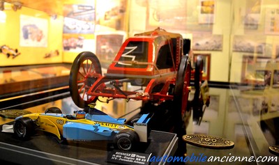 Seconde étape du parcours, la salle François Szisz est réservée à la compétition automobile. Ici, on retrouve toujours des panneaux de photos et d’explications, des maquettes de voitures de courses, et toute une collection de médailles et de quelques trophées récoltés par Renault dans diverses compétitions. Les explications donnent une large part aux records de vitesses, aux traversées du désert, au Paris Dakar, jusqu’à la formule 1 et les très récents titres de Renault en 2005 et 2006.