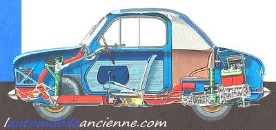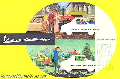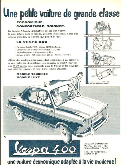 Au final, la petite Vespa est prête courant 1957, sa présentation intervient le 26 Septembre 1957 dans le Bois de Boulogne. Petite voiture aux lignes harmonieuses, la Vespa 400 (tel est son nom) pouvait transporter deux personnes. Mue par un monocylindre de 393cm3 dont la puissance affiche seulement 12Ch, la voiture était capable de performances proches de la Renault Dauphine, aidée en cela par son faible poids (375kg). Notons également, sur le plan technique, que la Vespa 400 se dote alors d’une boite à trois rapports, et côté suspension, les roues arrières sont indépendantes tandis que les roues avant reçoivent un ingénieux système de ressorts incorporés aux amortisseurs.