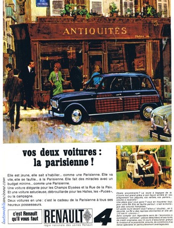 Présentée en 1961, la Renault 4 vise une clientèle très large en s’insérant sur le créneau des voitures populaires aux côtés de la 2CV. D’ailleurs, sur bien des points Renault semble s’être inspiré de la petite Citroën pour proposer sa voiture populaire, qui sur bien des points parait plus pratique. D’ailleurs, si la 2CV a une image de voiture rustique, Renault va travailler sa communication pour la R4 afin de la faire apparaître comme une voiture urbaine.